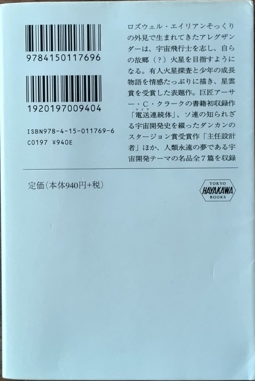 ロズウェル・エイリアンそっくりの外見で生まれてきたアレグザンダーは、宇宙飛行士を志し、自らの故郷(?)火星を目指すようになる。有人火星探査と少年の成長物語を情感たっぷりに描き、星雲賞を受賞した表題作。巨匠アーサー・C・クラークの書籍初収録作「【電送(ワイア)連続体」、ソ連の知られざる宇宙開発史を綴ったダンカンのスタージョン賞受賞作「主任設計者」ほか、人類永遠の夢である宇宙開発テーマの名品全7篇を収録。